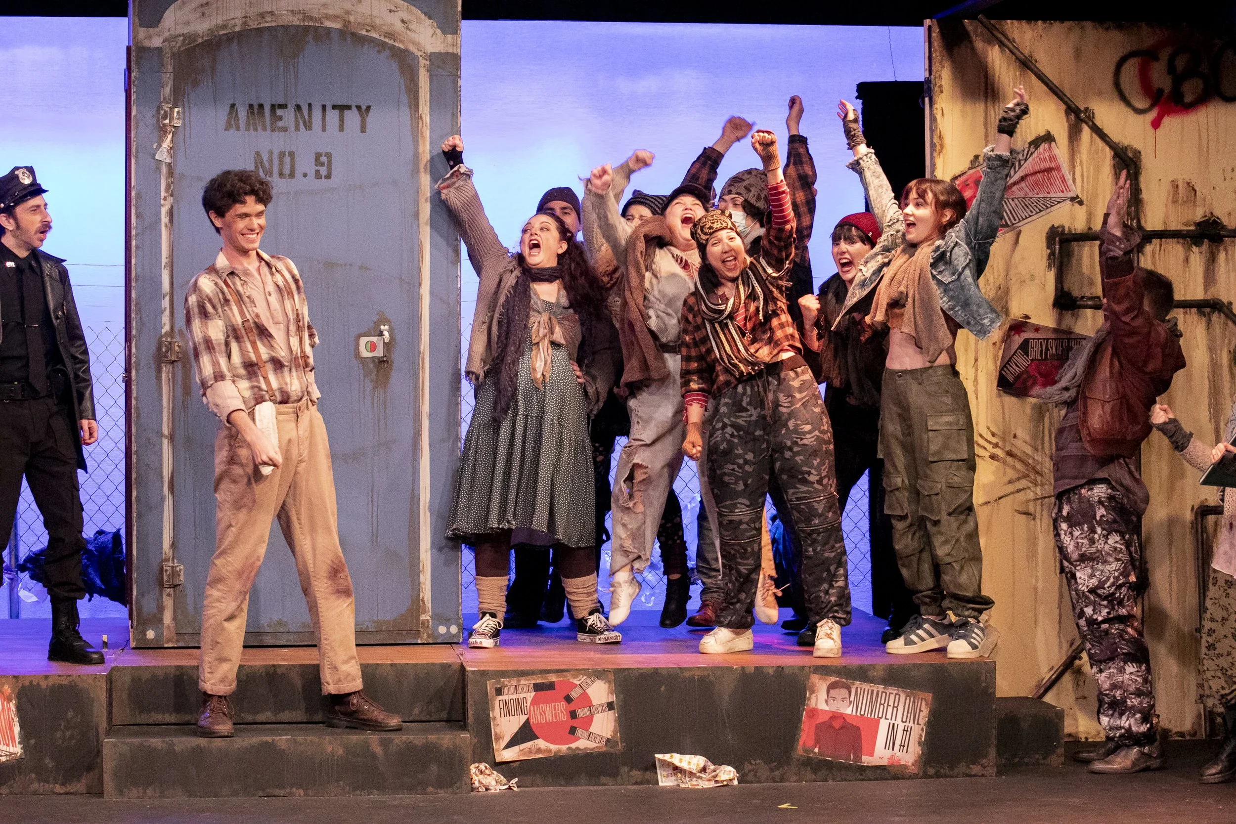 I had the privilege of working as the Scenic Painter for the Urinetown set at the Westchester Playhouse. The scenic painting included the aging and graffitiing of the distressed water pipes walls and porta-potty.